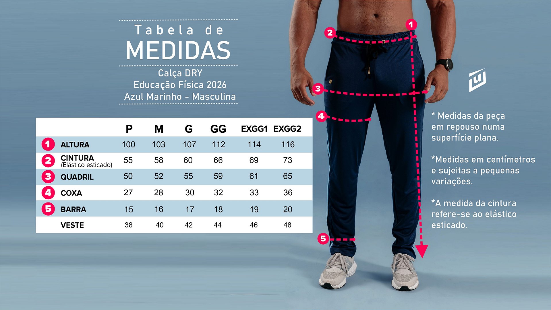 Mantendo os padrões tradicionais de uma calça sportswear de qualidade, a modelagem da Calça Educação Física 2026 Azul Marinho Masculina, possui um design diferenciado, que combinado ao caimento, resultam num estilo que são específicos e exclusivos da Umbilical. E o resultado é um modelo rico em detalhes, com recortes anatômicos em locais estratégicos. E para ajudar você a ter sua calça ideal para o seu corpo, é importante escolher o tamanho correto na nossa tabela de tamanhos.