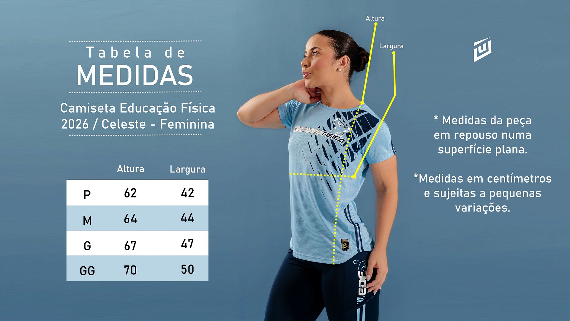 Comece colocando uma camiseta sua em uma superfície plana. Procure deixar ao máximo sua camiseta sem rugas e franzidos. Logo em seguida, com uma fita métrica, meça a altura e a largura. Pronto, agora é só comparar com as medidas da tabela e verificar qual tamanho mais se aproxima da sua Camiseta Educação Física Celeste 2026.