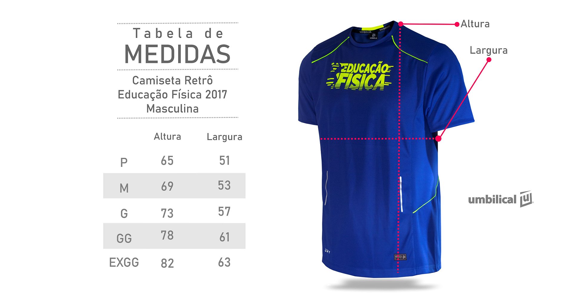 Nossa modelagem proporciona um design e caimento característicos das Camisetas Educação Física Umbilical, o que resulta em um modelo rico em detalhes e com recortes anatômicos em locais estratégicos. No entanto, para ajudar você a ter a camisa ideal para o seu corpo, é importante escolher o tamanho correto na nossa tabela de tamanhos.