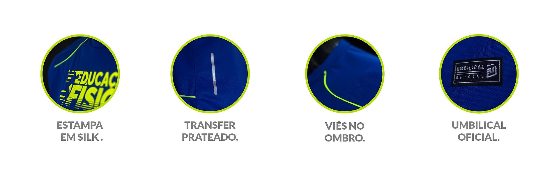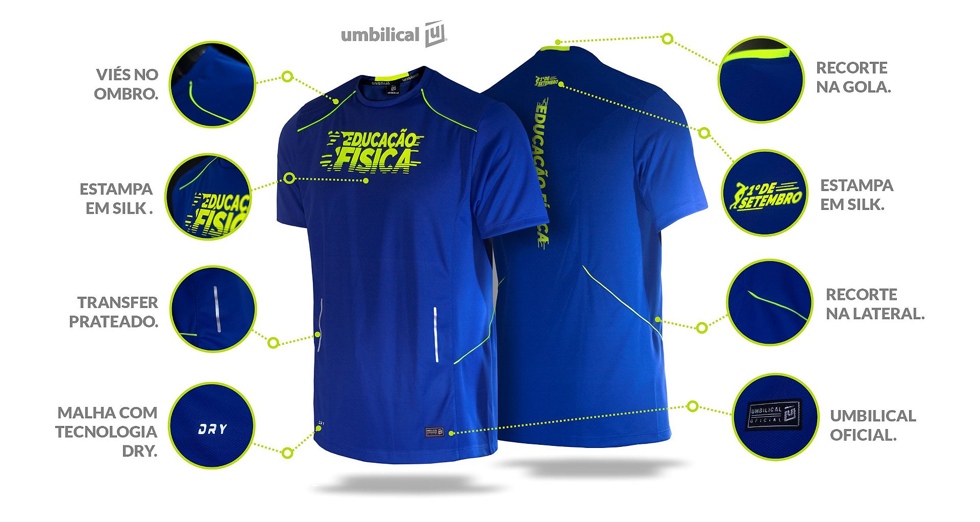 Para finalizar com a cereja do bolo, são utilizadas etiquetas bordadas com recorte a laser tanto no símbolo da Educação Física como na logomarca Umbilical, resultando numa peça toda harmônica com a combinação perfeita de modelagem, caimento, conforto, design, cores e acabamento.