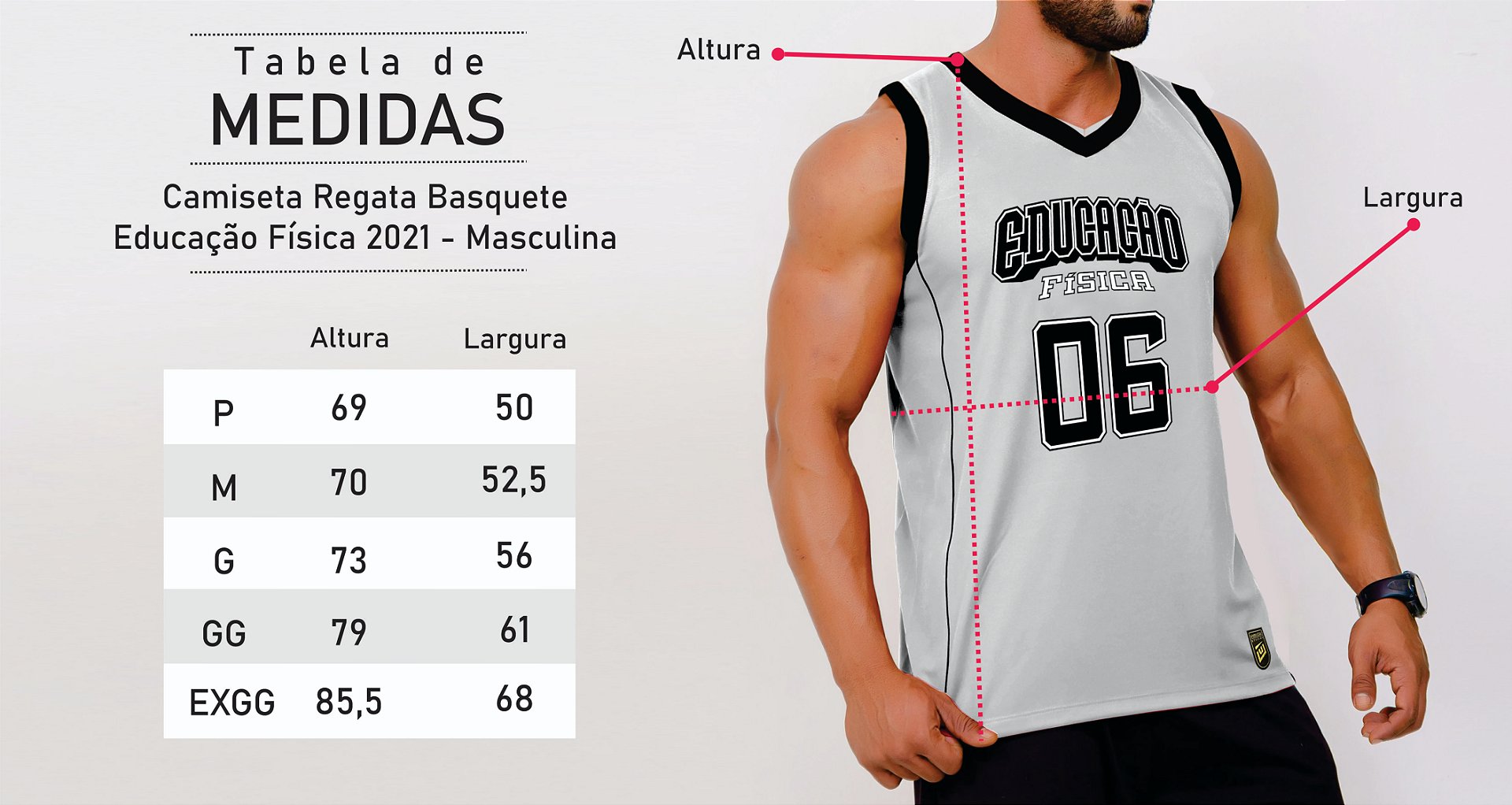 Para auxiliar na escolha correta do tamanho da sua Camiseta Regata Basquete Educação Física 2025 da Umbilical, é necessário estar atento a todas as informações da nossa tabela de medidas. Abaixo, temos um exemplo para usá-la da maneira correta: