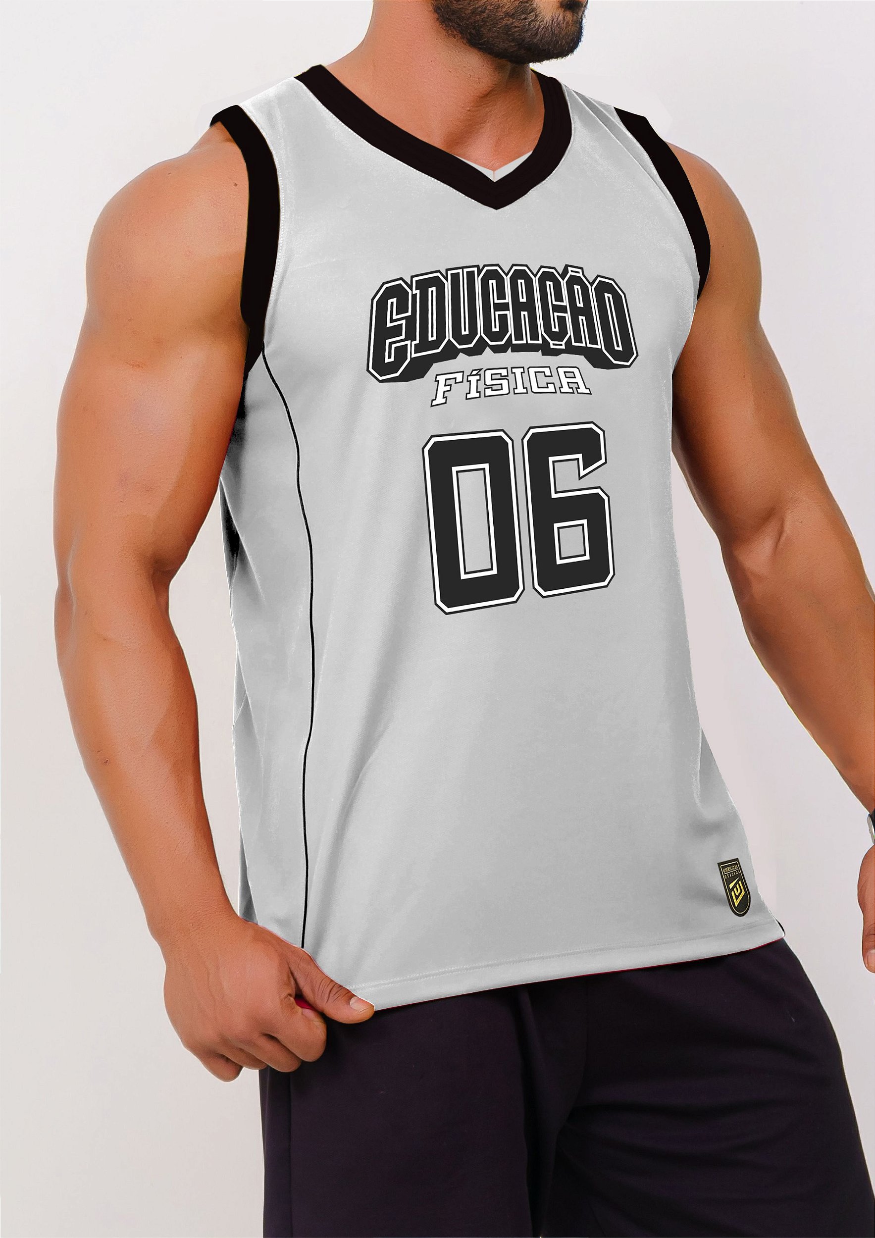 Sua cor predominante é o cinza gelo e seus detalhes em preto formam uma combinação clássica de cores para uma Camiseta Regata Basquete. Um dos detalhes que se destaca no modelo Camiseta Regata Basquete Educação Física 2025 é o brasão da Educação Física bordado com acabamento de recorte a laser, que se encontra na parte superior das costas.